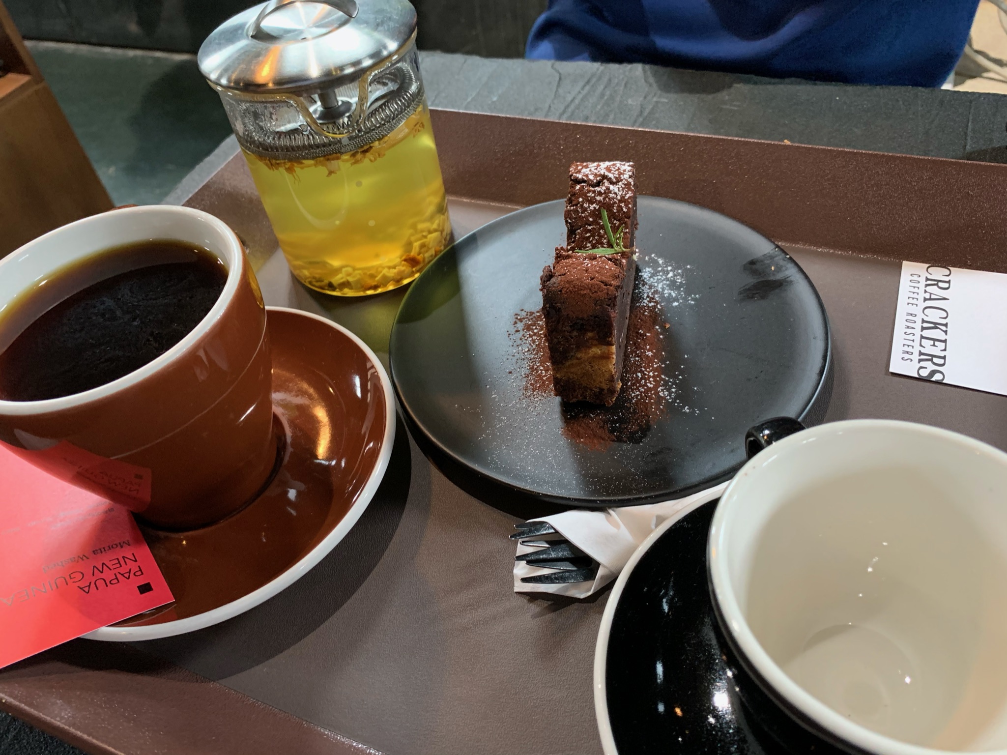 커피 하나, 티 하나, 꾸덕-한 브라우니 하나를 주문.